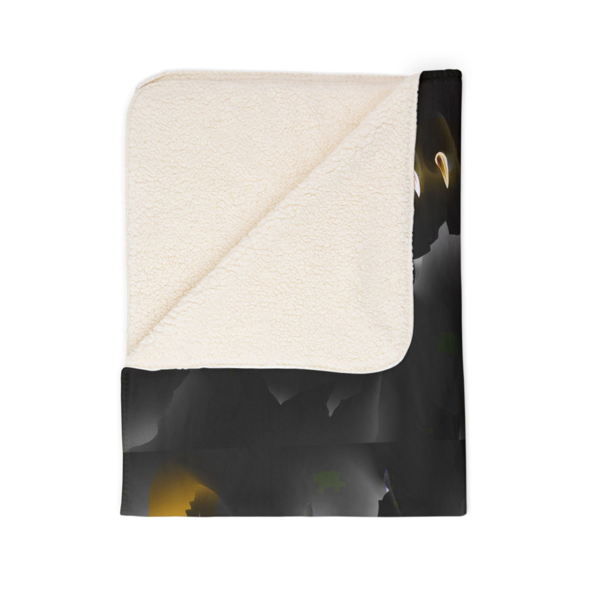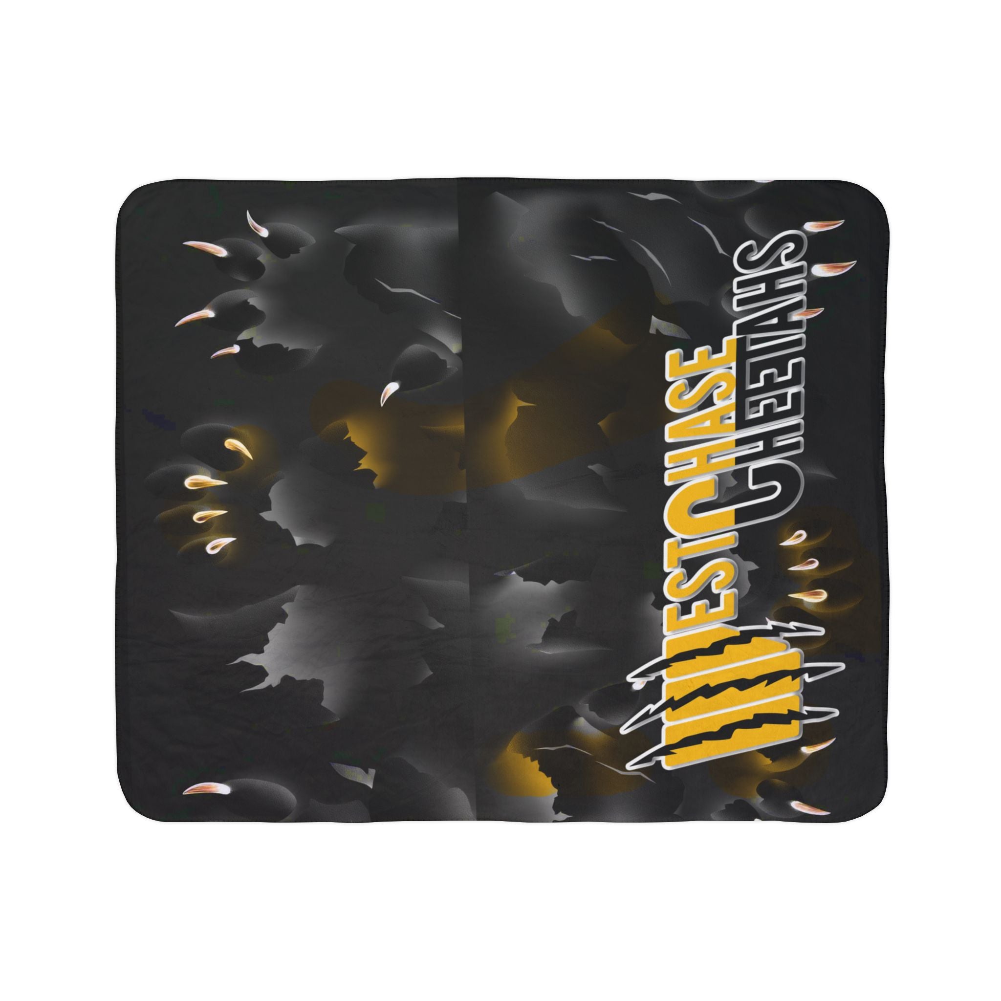 A plush sherpa fleece blanket that brings stadium energy into quiet moments. Deep charcoal and black form a smoky backdrop while golden-yellow accents and claw-mark graphics punch through with school-spirit attitude. The single-sided print highlights a bold team name layout, layered over distressed textures for a lived-in, rugged look. Thick, double-sided fluff wraps you in warmth and the hemmed edges keep the silhouette neat after repeated use. Toss it over a couch for game-day huddles, drape it in a dorm for late-night study breaks, or wrap up on chilly evenings when you want that charged, connected feeling.